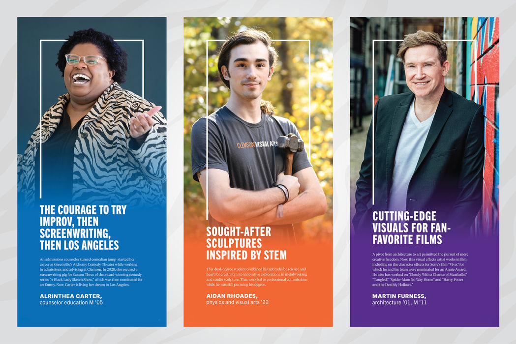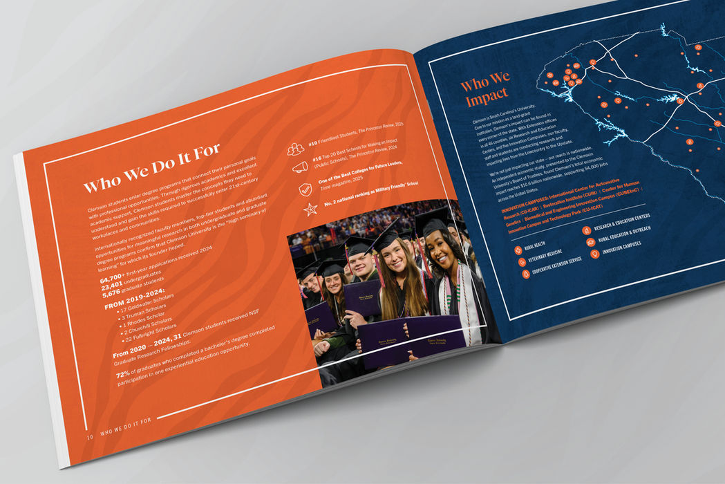 At Clemson University, the work centers on shaping how the world sees and experiences the brand. From bold print pieces and social storytelling to digital campaigns, visual identities, and immersive campus moments, every project helps bring the Clemson story to life—unified, clear, and creatively charged.